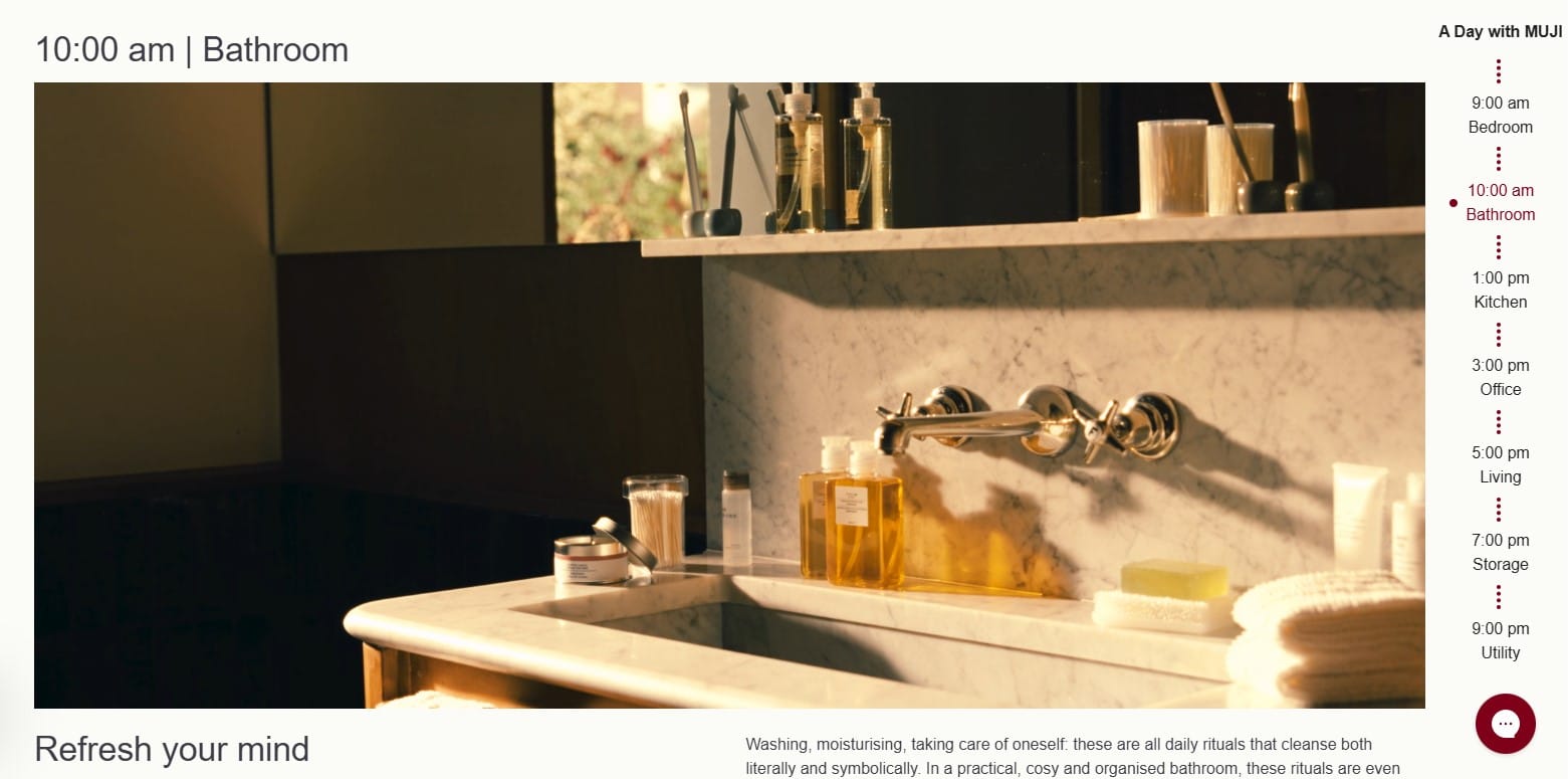 “A Day with MUJI” unfolds across different times of day and different rooms of the home, each moment paired with advice and a selection of items.